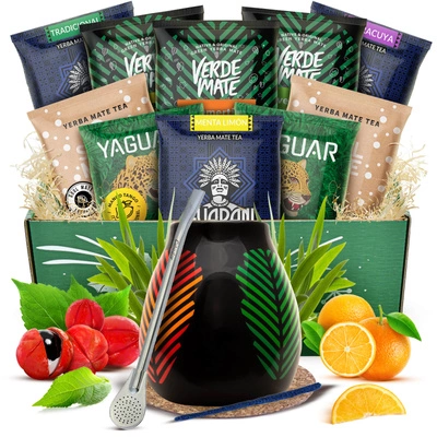 Yerba Mate -setti: näytteet 10x50g + 2× Kalebassi + 2× Bombilla