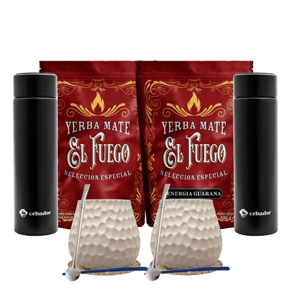 Yerba Mate -setti kahdelle: El Fuego 2x500g + 2x Termospullo LED + 2× Kalebassi + 2× Bombilla