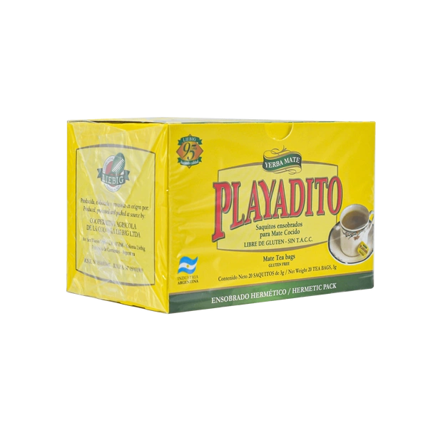 Playadito Saquitos - klassinen yerba mate ilman lisäaineita, pakattu teepusseihin. Aromikas ja mieto, tuskin havaittavaa katkeruutta. Kätevän annospussin pakkausmuodon ansiosta teeuute voidaan valmistaa nopeasti ja helposti - kaada vain kuumaa vettä mate-teen päälle ja odota muutama minuutti. Playaditon tuottaja on tunnettu argentiinalainen yritys Cooperativa Agricola de la Colonia Liebig, joka on tuottanut yerba matea jo yli 95 vuotta.