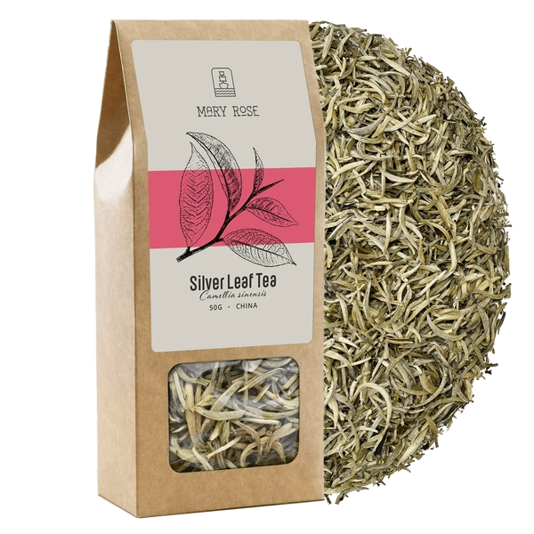 Mary Rose Silver Leaf on valkoista "Silver Needle" -lajikkeen teetä. Sen lehdet näyttävät aivan hopeaneulasilta. Se on yksi maailman kalleimmista teelajikkeista - eikä ole yllättävää, että sen tuotantomenetelmä on hyvin tiukka. Valkoinen tee kasvaa Fujianin maakunnan vuorenrinteillä Kiinassa. Se valmistetaan nuorista lehdistä, jotka poimitaan käsin maaliskuun lopussa tai huhtikuun alussa. Ne kerätään vain kahtena päivänä vuodessa, kun lehtien silmut ovat juuri puhkeamassa, ja vain aamulla, kun aurinko valaisee istutusta riittävästi. Sadonkorjuun jälkeen nuoret teelehdet käyvät läpi hellävaraisen hapettumisprosessin, jonka aikana ne saavat kirkkaan värinsä ja ainutlaatuiset ominaisuutensa. Valkoisesta teestä valmistetulle juomalle on ominaista mieto, miellyttävä maku, jossa on hieman makea vivahde.