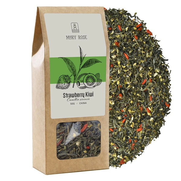 - Mary Rose Strawberry Kiwi on mielettömän maukas yhdistelmä yunnanilaista vihreää teetä ja hedelmiä - vihreää kiiviä, makeaa mansikkaa, kuivattuja goji-marjoja ja sitruunankuorta. Kokeile ja uppoa ihanan hedelmäiseen makuun ja tuoksuun!