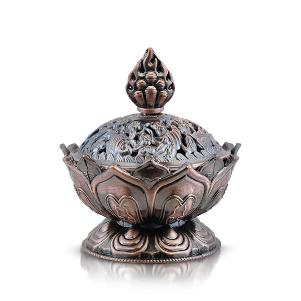 "Lotus"-suitsutin / poltin on ihanteellinen valinta itämaisen tunnelman ja kauniiden tuoksujen ystäville. Tyylikäs arkun muotoinen suitsukkeenpidin on valmistettu korkealaatuisesta sinkkiseoksesta Kaukoidän tyyliin. Pidikettä koristavat buddhalaiset motiivit symboloivat sitä, mikä ihmisessä on positiivista ja toivottavaa. Lootuksen kukka on jumaluuden, puhtauden ja viisauden symboli, ja Śrīvatsa eli loputon solmu on onnen ja vaurauden symboli. Pidikkeen mukana toimitetaan kansi - yhtä kauniisti koristeltu. Se toimii paitsi suitsukkeiden polttamisen lisävarusteena myös tyylikkäänä koristeena. Pidikettä voidaan käyttää monella tavalla - voit polttaa suitsukesiruja tai -jauhetta, asettaa siihen kartiomaisia suitsukkeita tai kaataa siihen erityistä hiekkaa ja pistää siihen sitten suitsukkeita.