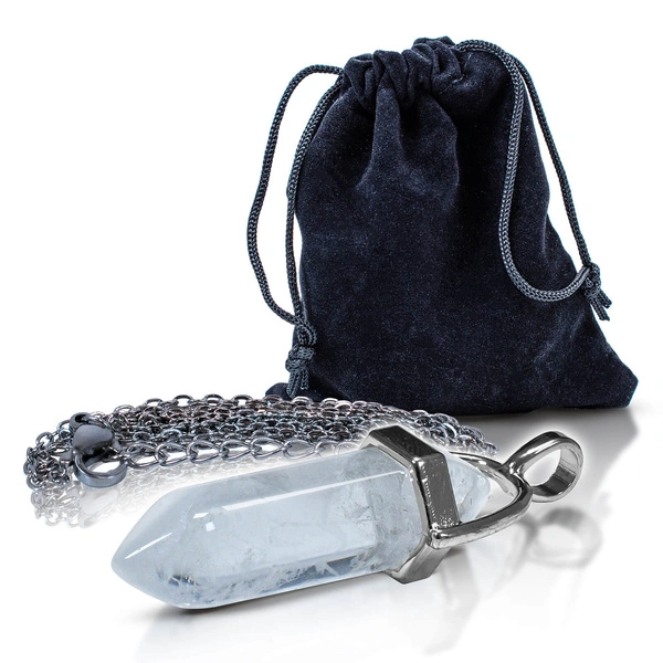 Muoto: hiottu vuorikristalli metallikehyksessä (ketjulla), pakattu mustaan pussiin.