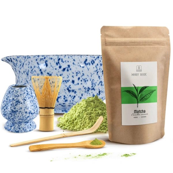 Matcha-teen valmistustarvikkeet: matcha 100g + tarvikkeet
