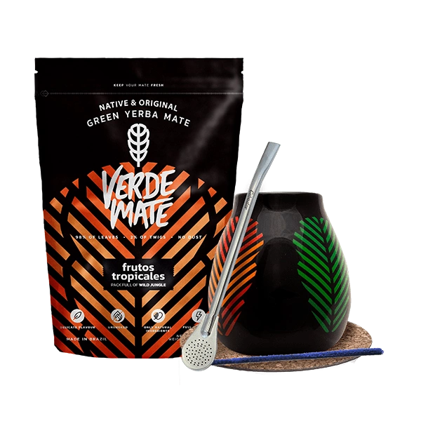 Yerba Mate -setti: Verde Mate Frutos Tropicales 500g + Kalebassi + Bombilla