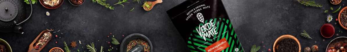 - Verde Mate Green Ashwagandha on tasapainoinen sekoitus vihreää brasilialaista yerba matea ja kasviperäisiä lisäaineita, kuten intialaista ashwagandhaa.