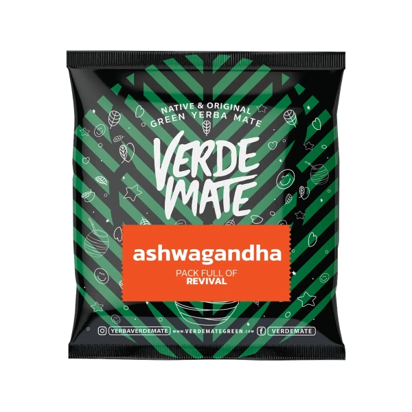 - Verde Mate Green Ashwagandha on tasapainoinen sekoitus vihreää brasilialaista yerba matea ja kasviperäisiä lisäaineita, kuten intialaista ashwagandhaa.