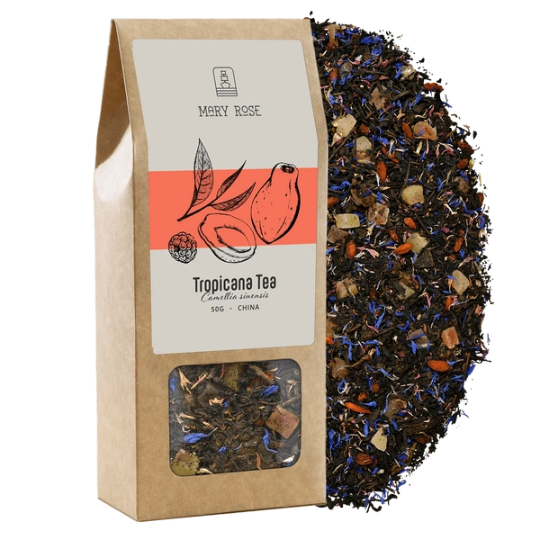 Mary Rose Tropicana on gourmet-teesekoitus, jossa yhdistyvät pu-erh ja makeiden trooppisten hedelmien, papaijan ja mangon, maku. Makeutta rikkovat hedelmäiset lisäykset goji-marjojen ja vadelmien muodossa. Mary Rose Tropicana-tee ihastuttaa paitsi maullaan, myös ulkonäöllään - siniset ja punaiset ruiskaunokin terälehdet hohtavat kauniisti kuivatussa teessä.