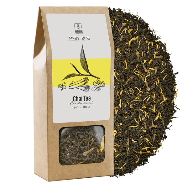 Masala Chai on perinteinen intialainen lämmittävä juoma, joka perustuu vahvaan mustaan teehen. Juoman valmistusresepti on periytynyt sukupolvelta toiselle, joten se on jokaisessa perheessä hieman erilainen. Lämpimässä Intiassa asuvat ihmiset nostavat ruumiinlämpöään juodessaan lämmittävää juomaa ja vähentävät näin oman ruumiinsa ja ympäröivän ilman lämpötilan välistä eroa. Näin on helpompi kestää painostavaa kuumuutta. Masala Chai -juoma valmistetaan lisäämällä siihen mausteita ja maitoa, joka pehmentää makua hieman. Makeuden lisäämiseksi lisätään usein sokeria tai hunajaa. Mary Rose Chai Tea tavoittaa täydellisesti intialaisen juoman maun. Musta assam-tee yhdistetään tässä tyypillisiin mausteisiin: neilikkaan, kaneliin, inkivääriin, kardemummaan ja mustapippuriin. Visuaalisena aksenttina koostumusta korostavat keltaiset kehäkukan terälehdet. Jos haluat maistaa aitoa intialaista perinnettä, suosittelemme lisäämään teehen hieman maitoa. Herkullista!
