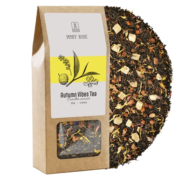 Mary Rose Autumn Vibes -tee saa sinut miellyttävään, syksyiseen tunnelmaan heti ensimmäisistä kulauksista lähtien. Mustan yunnanin teen intensiivinen maku yhdistyy upeasti tyypillisten syyshedelmien - kvittenin ja pihlajan- kanssa. Yllättävä ainesosa tässä teesekoituksessa on kandeerattu inkivääri - makea, mutta jättää hieman polttavan tunteen makuun. Mausteinen vivahde korostuu luonnollisen neilikkaöljyn lisäämisen ansiosta, ja visuaalisesti kokonaisuutta täydentävät punaiset ruiskaunokin terälehdet ja keltaiset kehäkukan terälehdet.