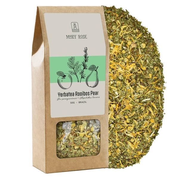 Mary Rose Rooibos Pear yhdistää tuoreen, brasilialaisen yerba mate -vihreän ja hennon rooiboksen maun, jossa on hieman hunajainen makuvivahde. Vaikka rooibos ei oikeastaan ole teetä - se ei ole peräisin teekasvista, Camellia sinensis - sitä rinnastetaan usein teehen, ja jotkut kutsuvat sitä jopa punaiseksi teeksi. Tämä johtuu rooibosin lehtien punaisesta väristä, joka yhdistettynä Ilex paraguariensis -lajin elinvoimaisen vihreään väriin muodostaa erittäin mielenkiintoisen ja värikkään koostumuksen. Seoksen mehukkuutta lisäävät kuivatut hedelmät, kuten päärynä ja omena, ja kokonaisuutta täydentää hieman yrttinen vivahde kamomillan ja kehäkukan terälehtien ansiosta. Yerba maten ja teen yhdistelmällä on hieman heikompi piristävä vaikutus kuin "täysimittaisella" yerba matella. Lisäksi rooibos on tunnettu kofeiinittomuudestaan. Yerbatea sopii siksi erinomaisesti aloitteleville infuusion harrastajille, jotka eivät vielä tunne yerba maten stimuloivaa voimaa.